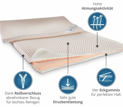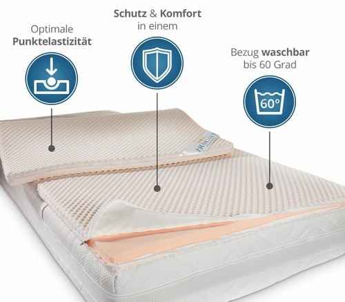 Der Bezug lässt sich mit einem 3 Seiten Reißverschluss bequem abnehmen und bei 60 °C waschen. Vier stabile Eckgummis fixieren den Topper sicher auf der Matratze und verhindern Verrutschen. Die Materialien sind hautfreundlich, geruchslos und schadstoffgeprüft für ein dauerhaft frisches Schlafgefühl.