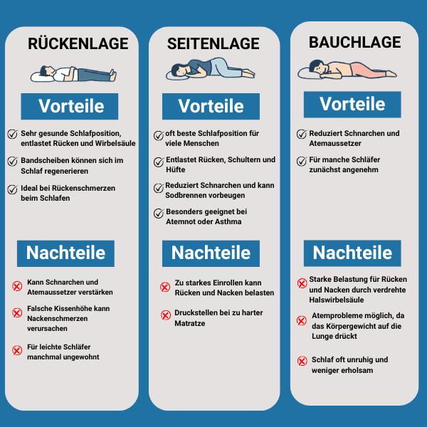 Jede Schlafposition hat ihre guten und weniger guten Seiten. Entscheidend ist, dass sie zu Ihrem Körper und Ihren Schlafgewohnheiten passt. Hier finden Sie die wichtigsten Vor- und Nachteile im Überblick: