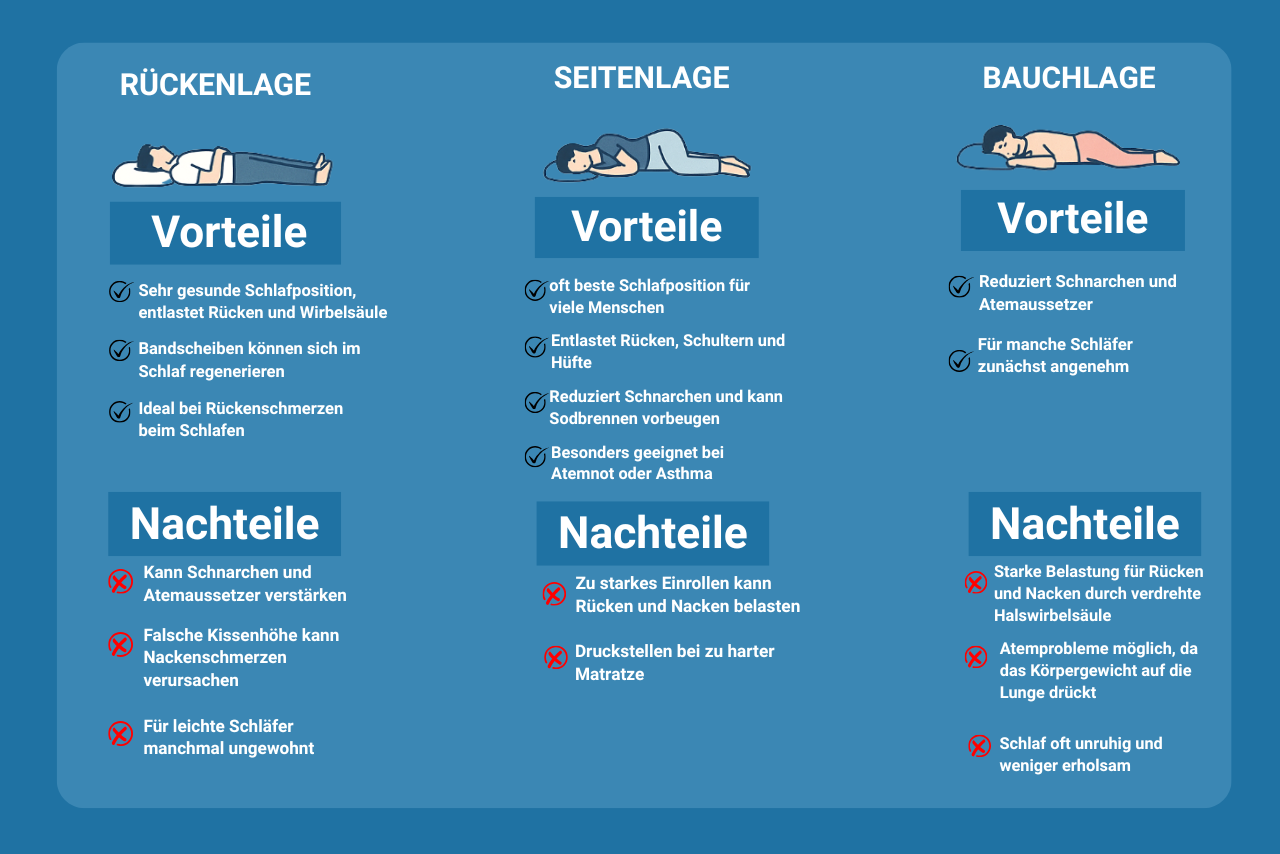 Jede Schlafposition hat ihre guten und weniger guten Seiten. Entscheidend ist, dass sie zu Ihrem Körper und Ihren Schlafgewohnheiten passt. Hier finden Sie die wichtigsten Vor- und Nachteile im Überblick: