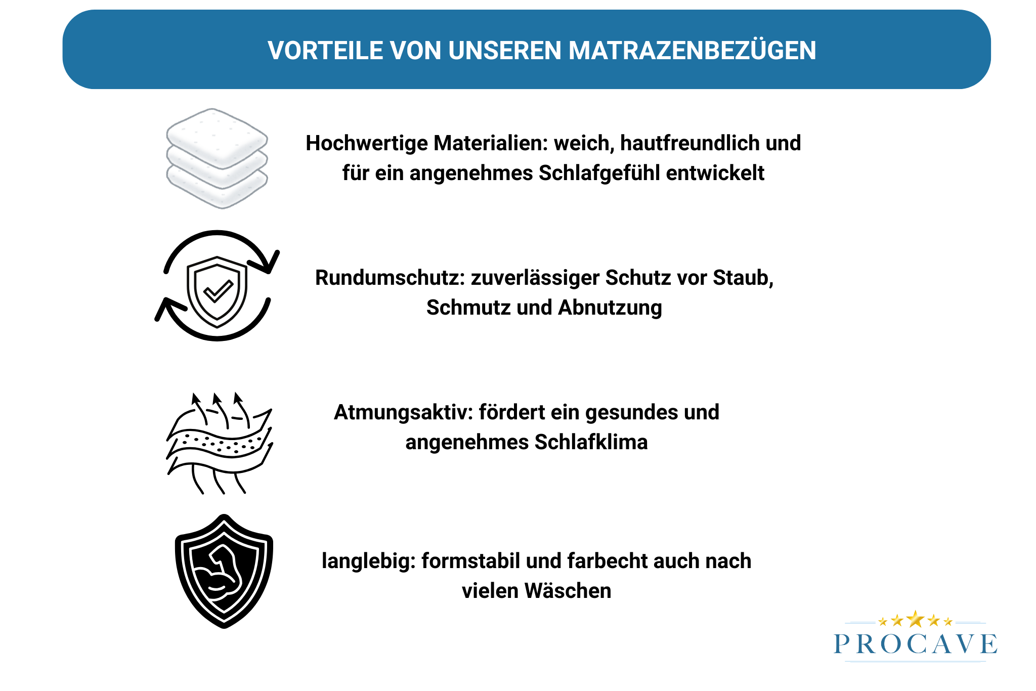 Mit einem PROCAVE Matratzenbezug schützen Sie Ihre Matratze zuverlässig, reduzieren den Aufwand bei der Reinigung und schaffen ein sauberes, komfortables Schlafumfeld. Wählen Sie online das Modell, das zu Ihren Anforderungen passt, und genießen Sie das gute Gefühl, in einem hygienisch gepflegten Bett zu liegen.